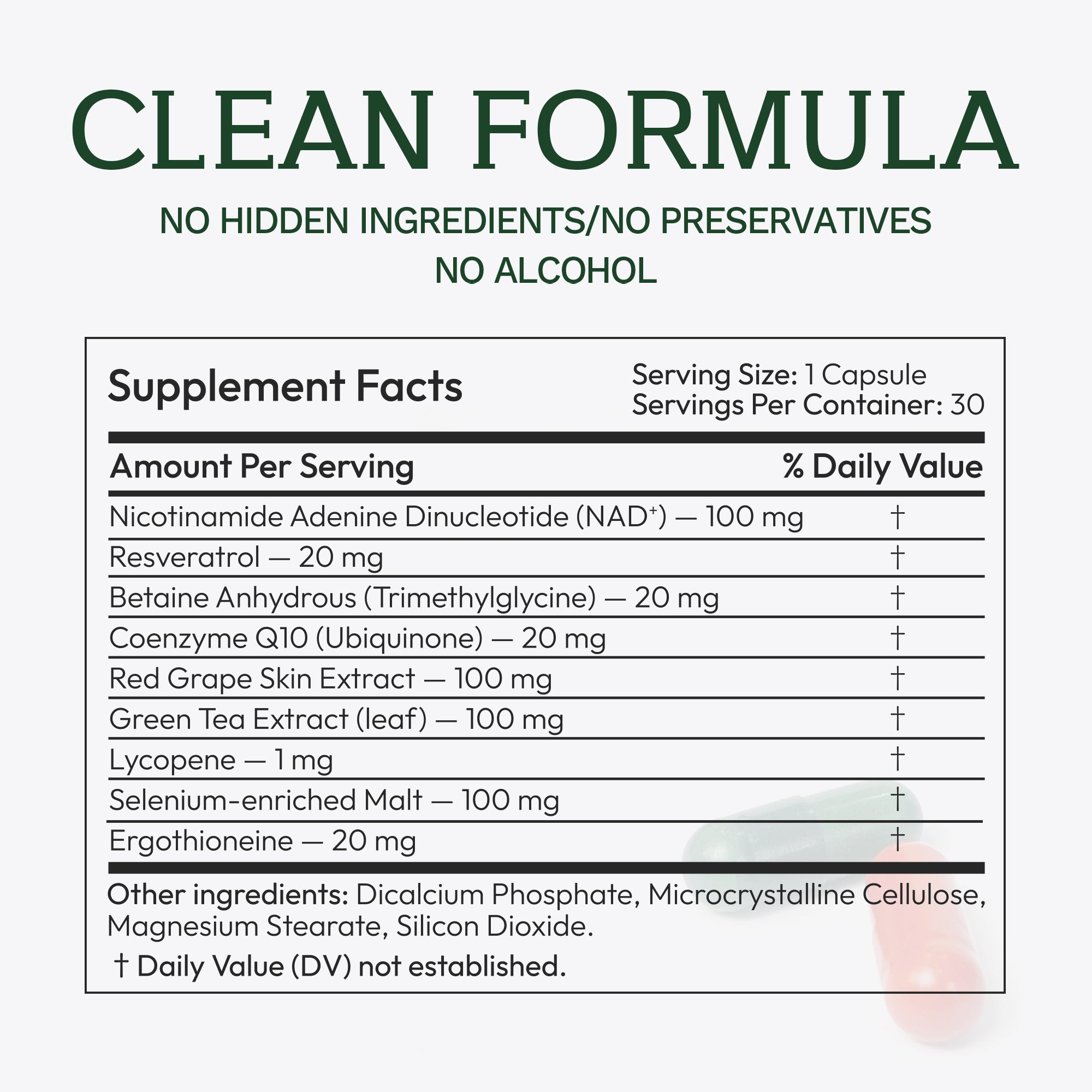 - Nicotinamide Adenine Dinucleotide (NAD+) — 100 mg (†)